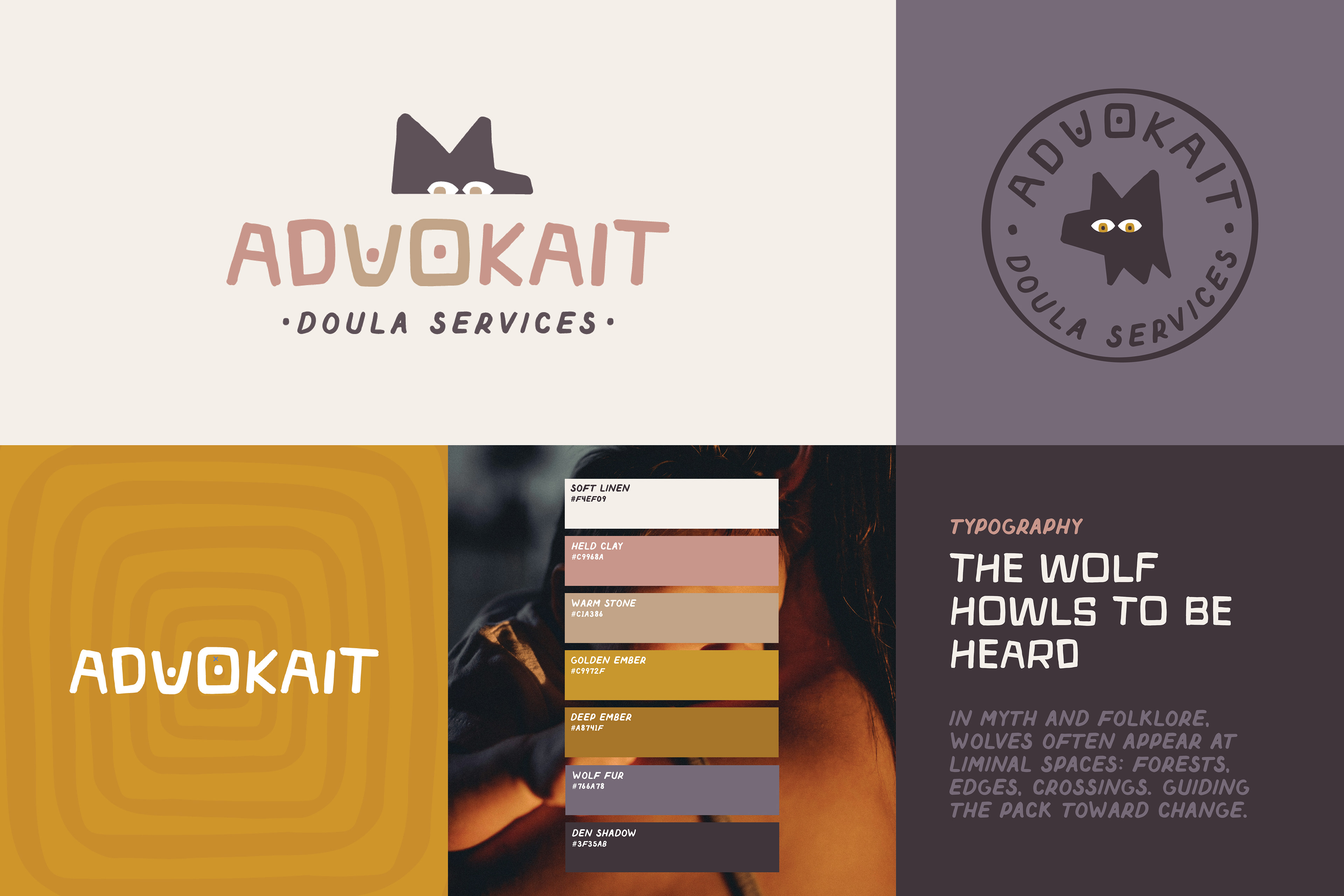 I designed the logo and visual identity to let Kaitlyn’s personality shine through — playful but purposeful, serious about birth justice without taking itself too seriously. I pitched the wolf as the central symbol — the ancestor of the dog: loyal, watchful, and just outside the system.