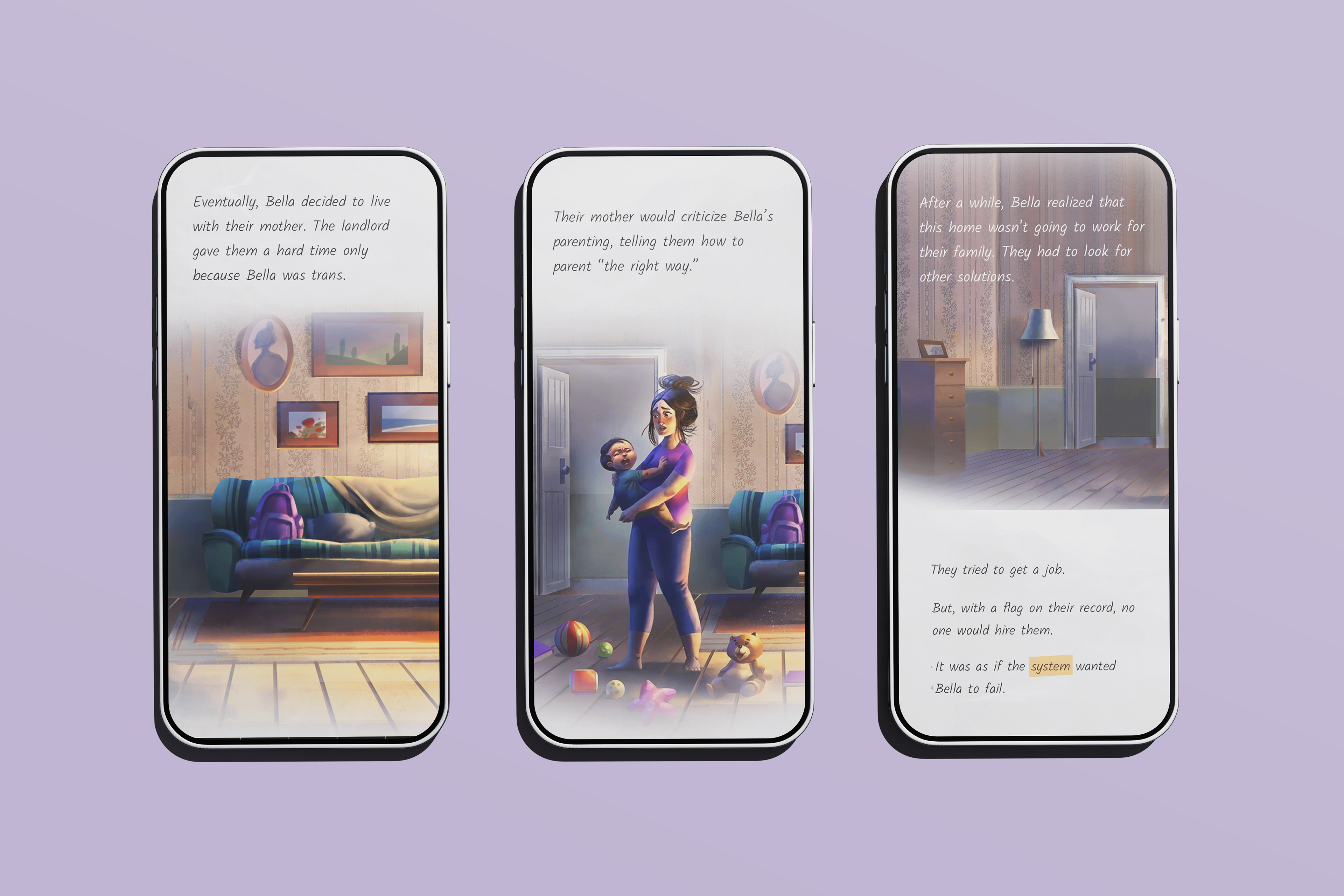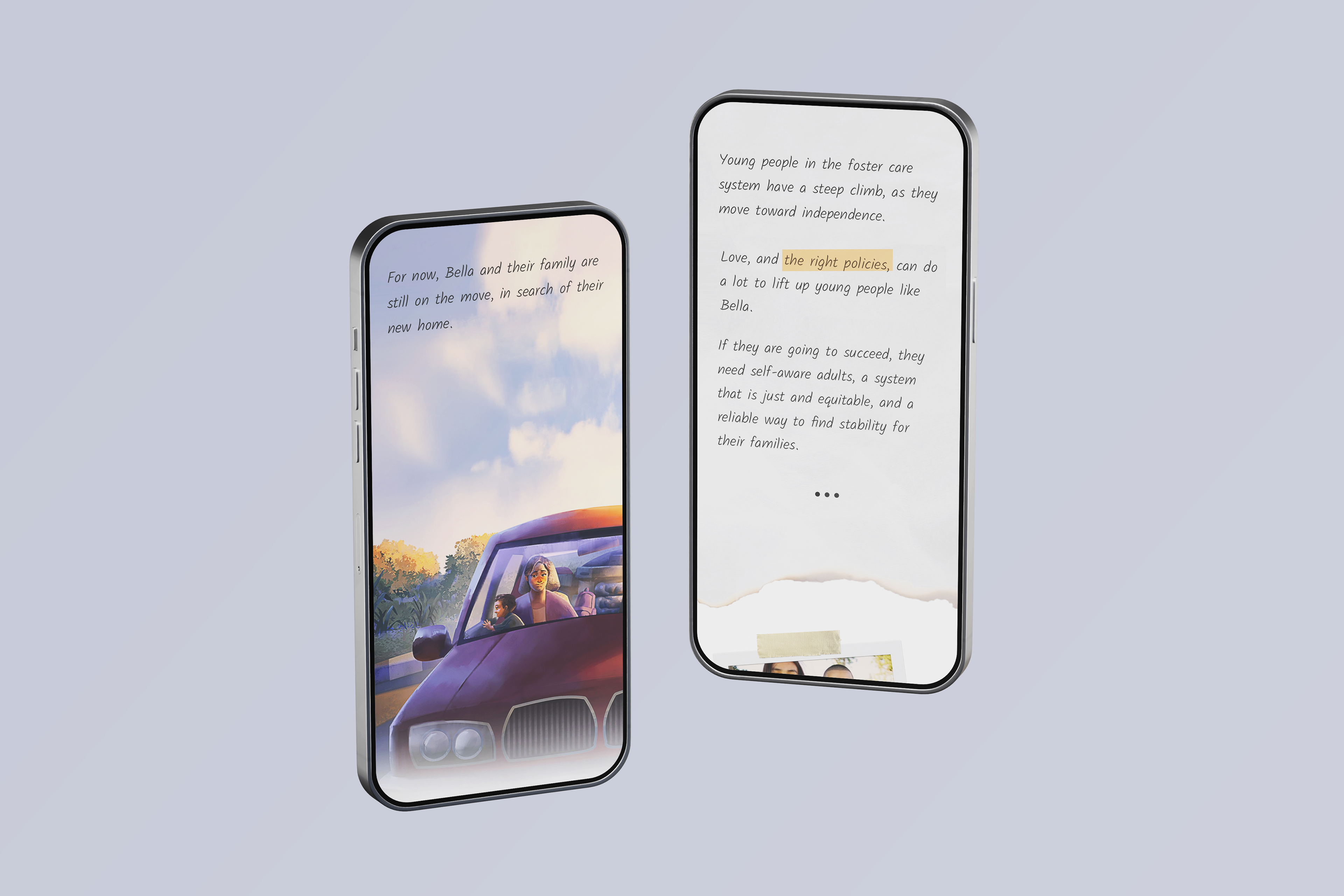 I was part of the creative team behind Young Parents’ Stories, a project sharing the real lived experiences of teen parents navigating the foster care system. I led art direction—collaborating with an illustrator and designer to bring these stories to life—and contributed to copywriting and information gathering.