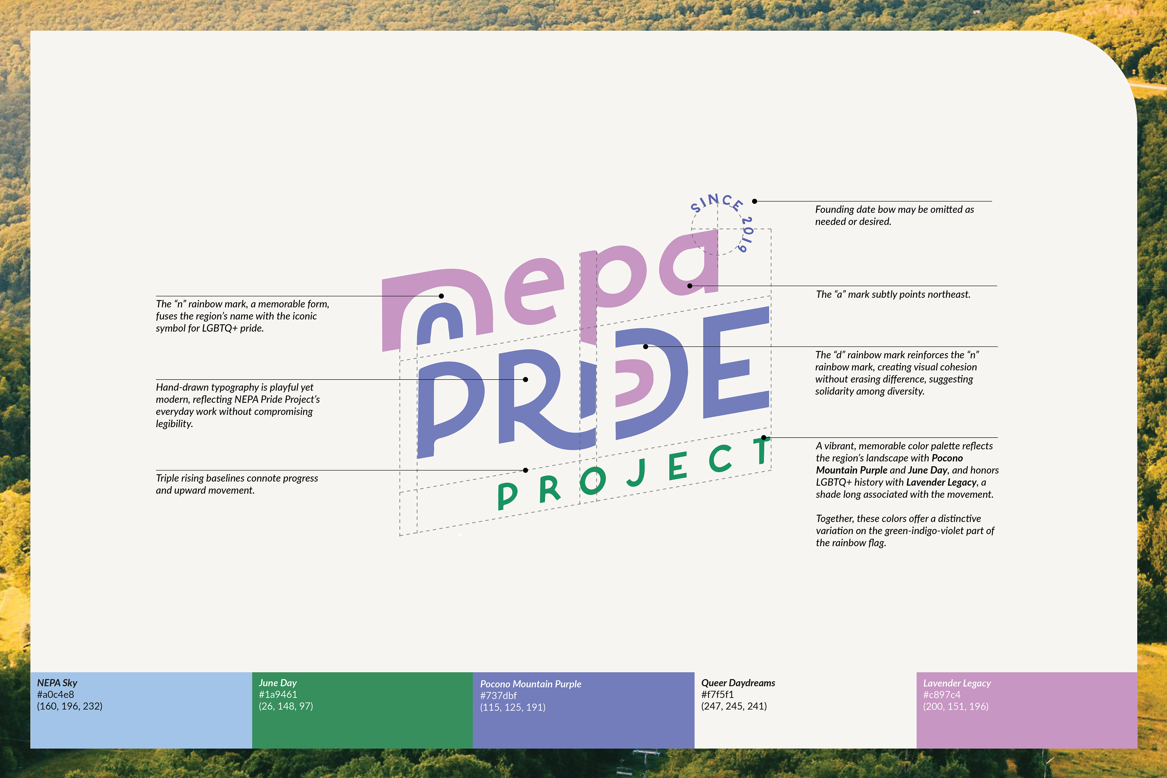 The new mark and identity I designed fuse the spirit of the Pocono and Endless Mountains with LGBTQ identity. The “n” mark draws on both the region’s name and the rainbow, an iconic symbol of the movement, creating a memorable form that feels regional yet resonant with the queer people everywhere.